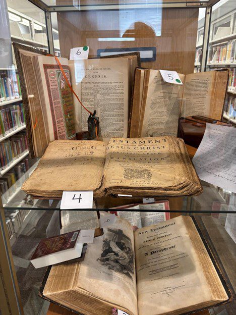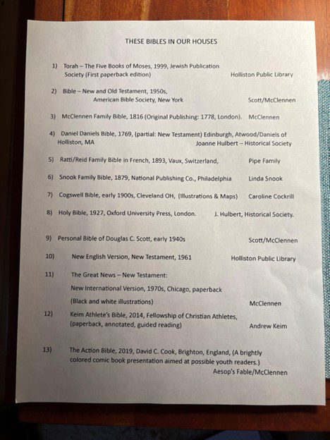 In my first reading, I missed a lot, so now I am reading it again. I realized how important this book is to the growth and development of our society as we know it and indeed to the whole world. So many people in our world read this book or know many of its guiding messages. Libraries house many great books. I thought it would be nice to highlight one of the most important books in the world. I turned to good friends and neighbors, the Holliston Historical Society and our Public Library to see what type of collection I might be able to put together for the display case in the library. I found 13 samples, new and old, easy to read and hard to read, colorful and simple black and white printed pages.