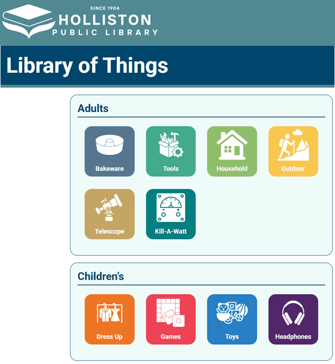 You can go online Holliston’s Library of Things (seen below) to view the item(s) that are currently in stock.