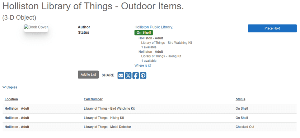 Clicking on the appropriate Thing category icon will show the items available. If the item is currently checked out, you may place a hold and receive a notice when it becomes available.