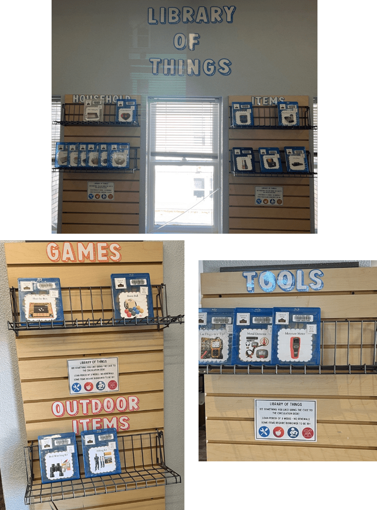 Thanks to the efforts of Taylor Dodge, HPL’s Head of Circulation and Adult Services, and grants and donations, adults and children can now borrow items that are needed once in a while. Instead of going to a hardware store to buy a stud finder to help hang a precious painting, you can borrow it for FREE!