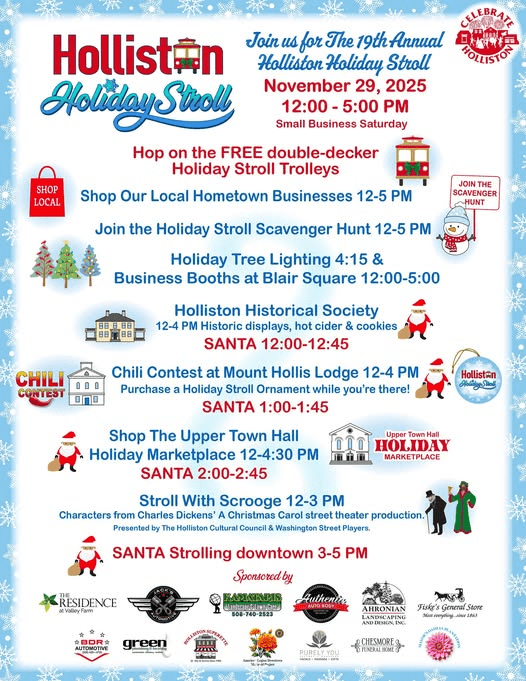 Do you have a Holliston based business and wish to encourage people to do their holiday shopping at YOUR business? Please fill out THIS BUSINESS PROFILE … through the period starting Monday 11/24 through 12/20 we’ll be featuring YOUR BUSINESS!