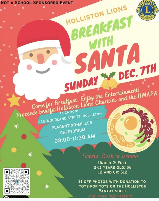 What would the Holliston holiday season be without the traditional celebrations? NOTHING! The Holliston Lions and numerous partners have been working tirelessly to “Light Up Holliston”. This year, as in past years, the Holliston Lions will visit their neighboring volunteers in Medway and purchase trees for Blair Square. The Holliston Lions (and pups) will also have a booth at Blair Square while other members are at Mount Hollis Lodge serving chili. Holliston Lions will also be kicking off Breakfast with Santa (check the QR code below for pricing, times, and more!).