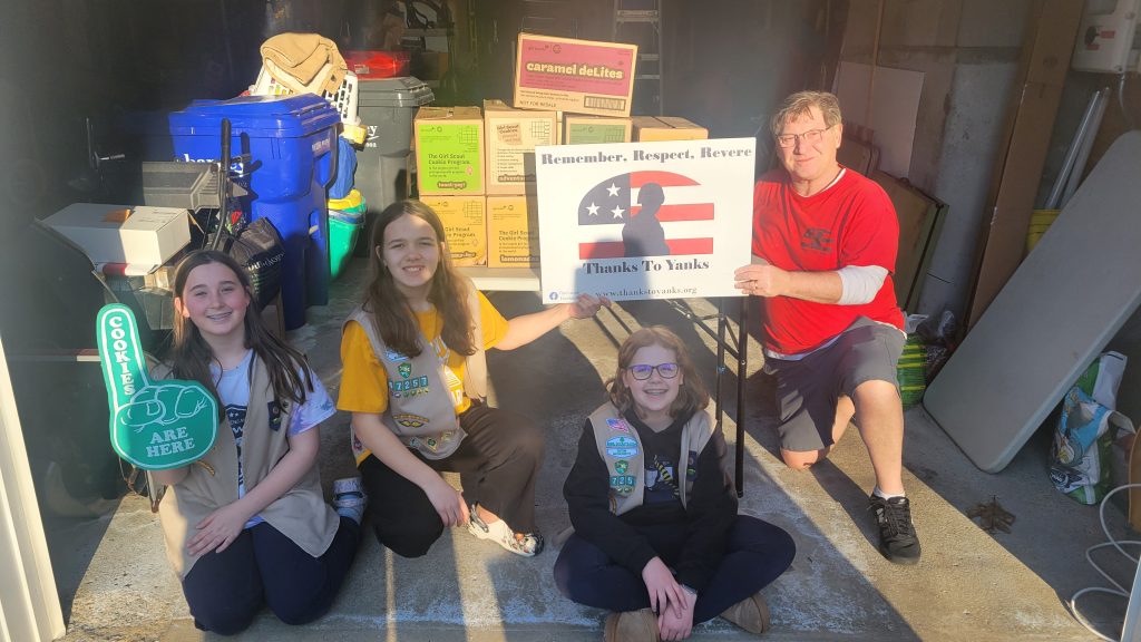 Medway, MA – Girl Scout Troops 67257 and 77238 from Medway, along with a donation from the Girl Scouts of Eastern Massachusetts, recently made a generous donation of Girl Scout cookies to the Thanks to Yanks Organization. Founded and led by Michael Shain, Thanks to Yanks is a non-profit organization dedicated to supporting military members, veterans, and their families.