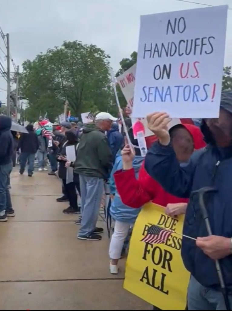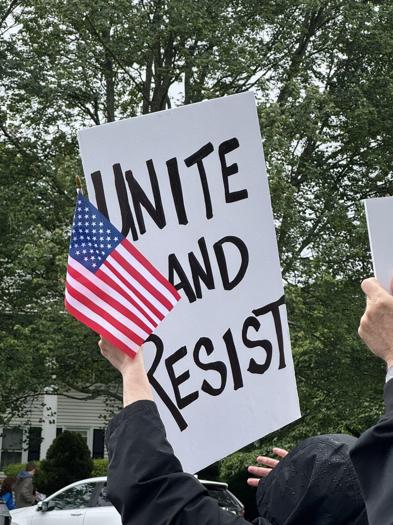 HOLLISTON, MA — A hand count showed that around 1,200 residents from Holliston and beyond gathered in front of Town Hall on Saturday, June 14. They joined up to eleven million Americans in a nationwide call to stop the Trump Administration’s assault on the Constitution; the Republic; and the law-abiding, hard-working people who live and work in the United States.