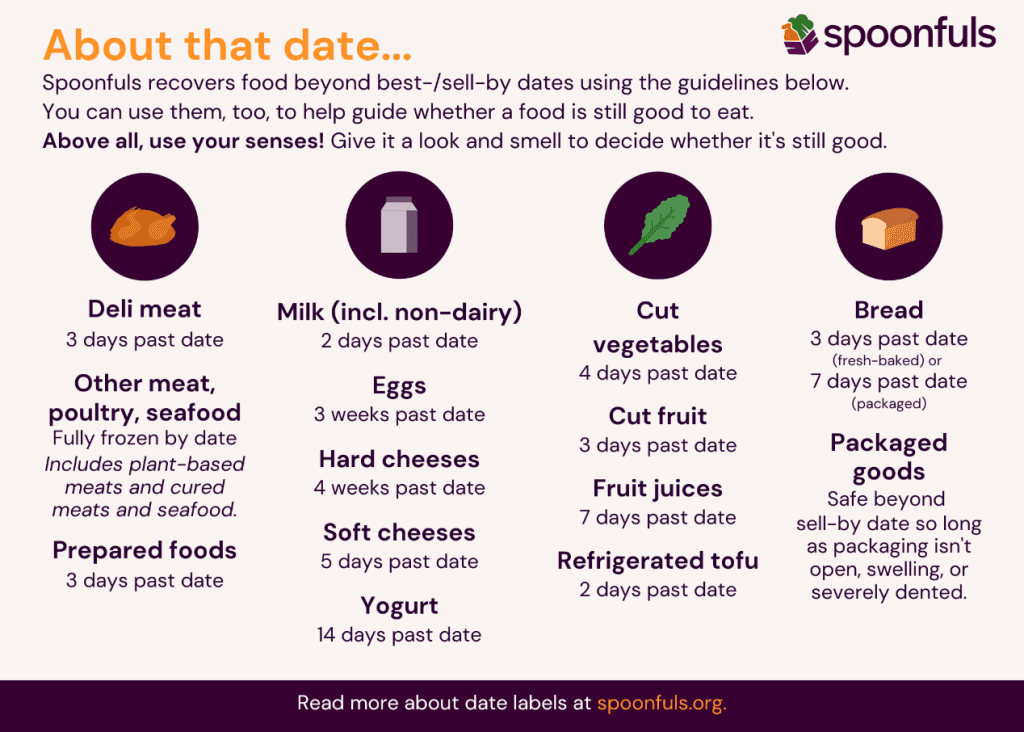 Typically, the Thursday Spoonfuls delivery arrives between 11am-2pm. Items remain available until they are depleted or still safe for use. Spoonfuls also provides date label guidelines (below) as a resource for The Center and its clients to determine whether food is still good to eat.